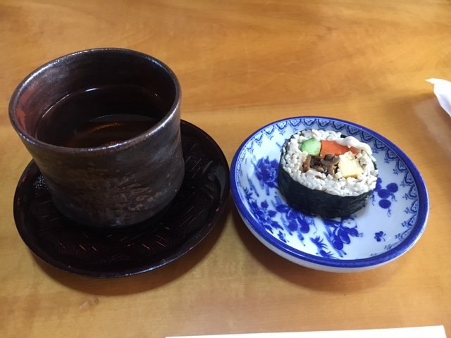 お食事の前に温かいお茶と日本蕎麦の手巻き寿司が