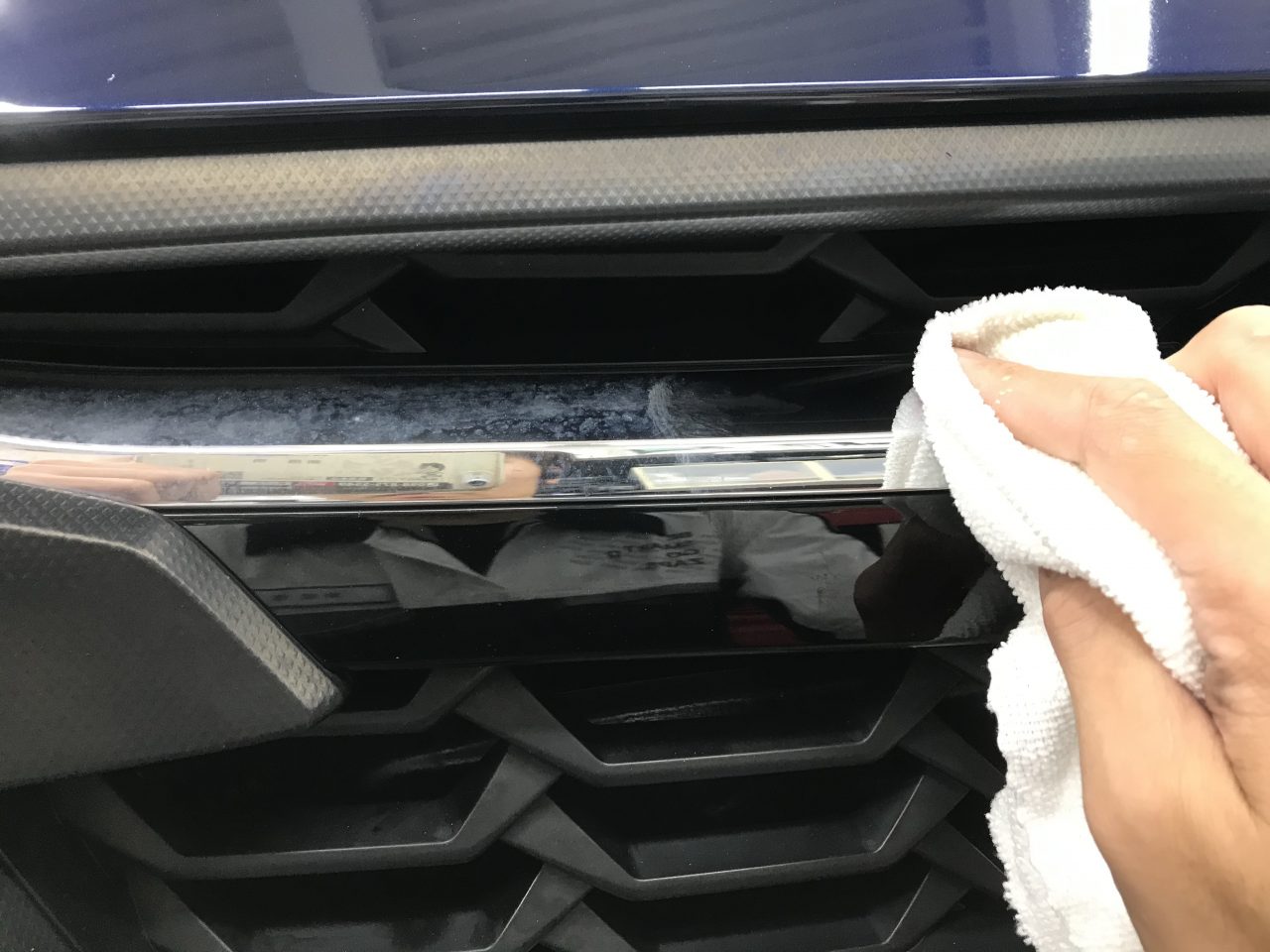 メンテナンスで入庫のお車が水シミなどの付着でメッキ部分がくすんでいていました。