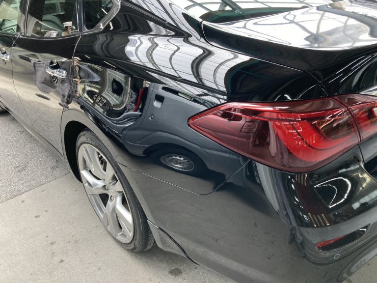 今回の入庫は、日産フーガのリヤフェンダーヘコミ補修です。