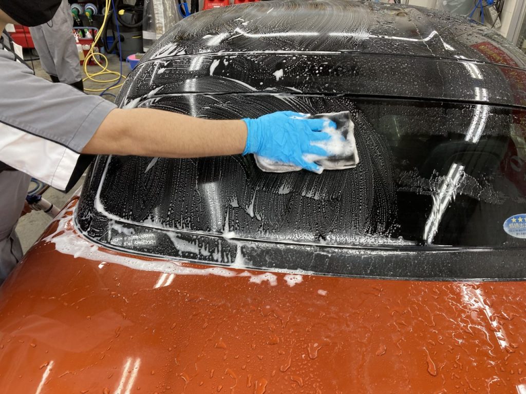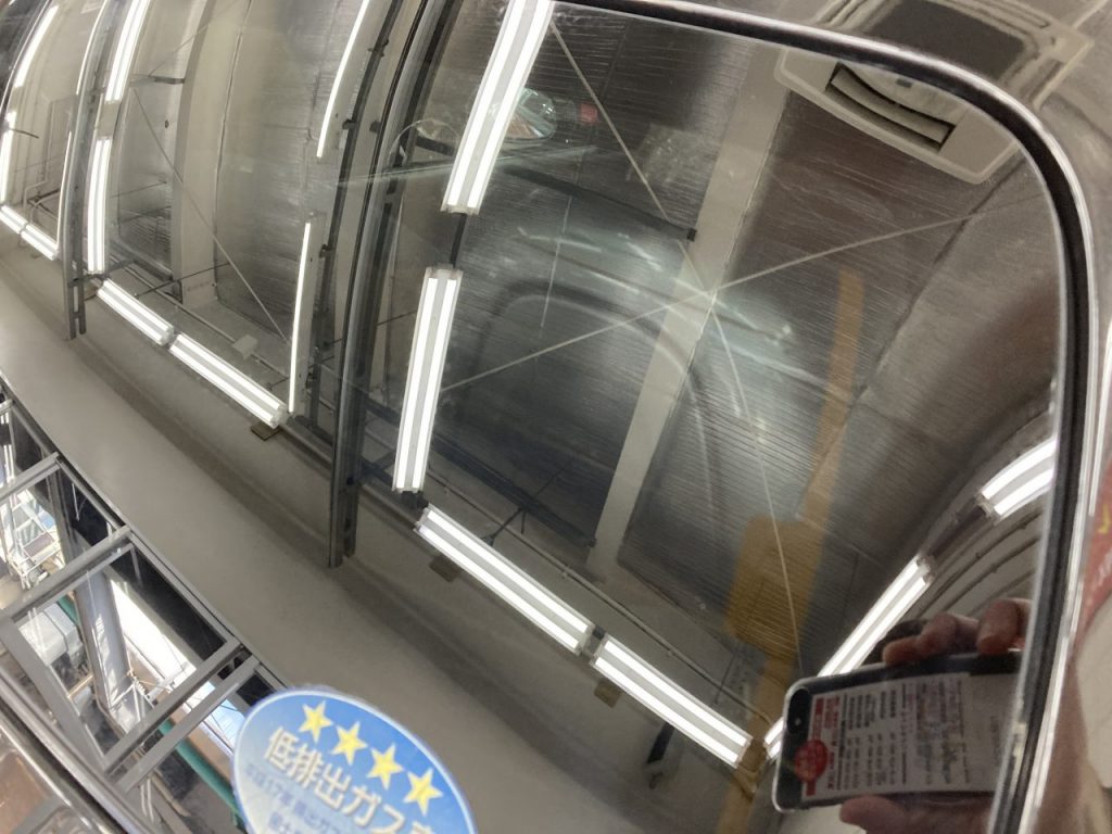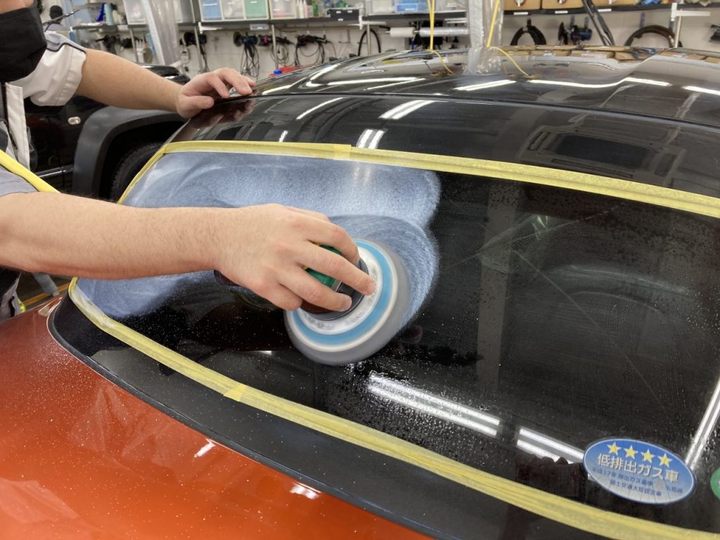 油膜と水アカがガラス全体に付着していて、見えずらくなっています。専用の研磨剤と研磨機を使って磨いていきます。