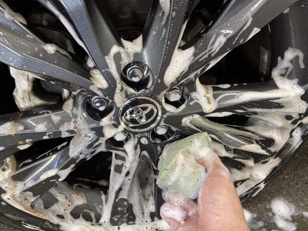 専用の洗浄剤と柔らかいブラシでブレーキダストを落としていきます。