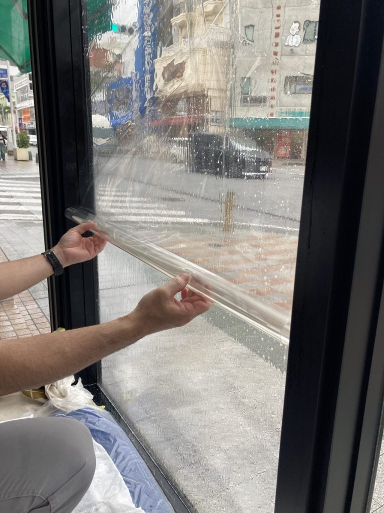 店内の雰囲気を崩さず変わらないようにとの要望もあり、今回 透明2MiLクリアー飛散防止フィルムを貼り付け致しました。