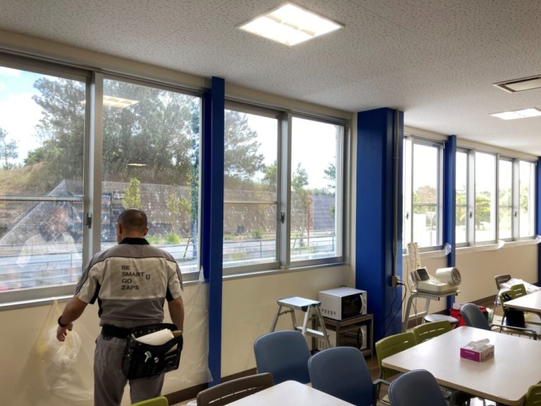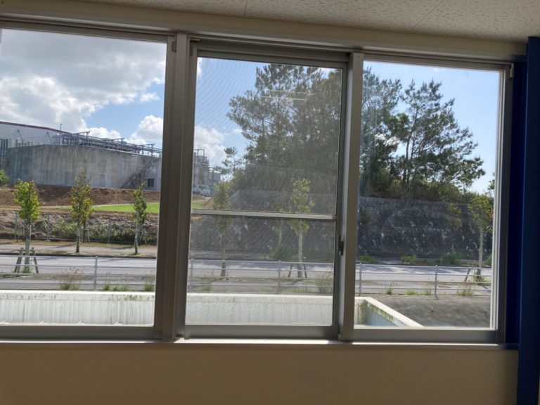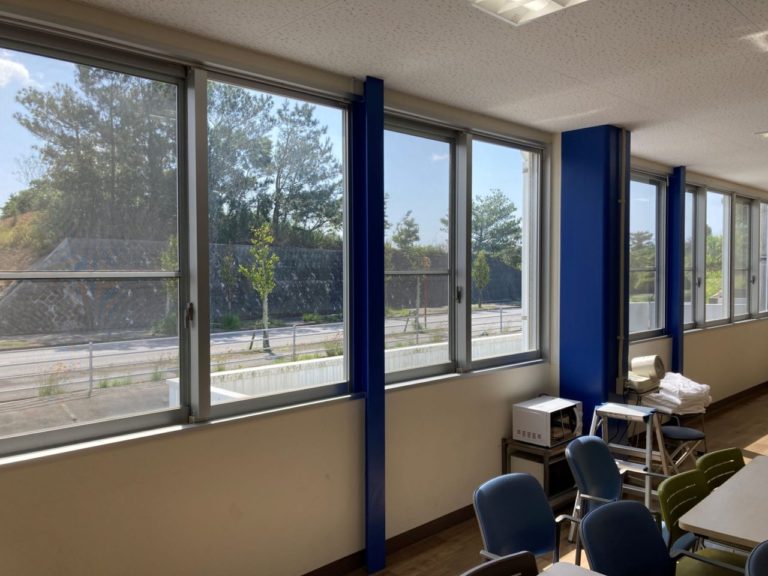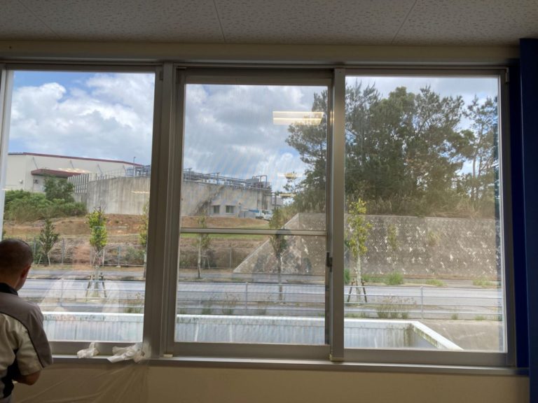 休憩室のエアコンが日差しにより効きが悪くなっている為 暑さ対策としてフィルム貼り付け致しました。