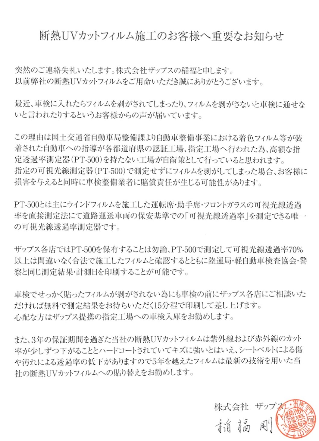 先日から、過去にザップスのフィルムを施工いただいたことのあるお客様へお知らせのお手紙✉を