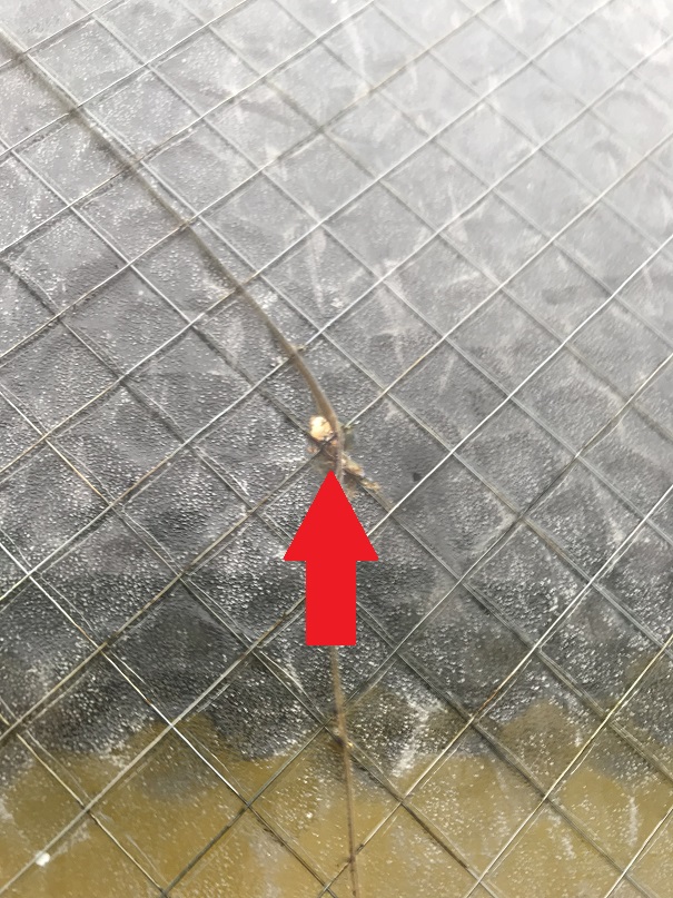 画像をアップにしてみました。矢印の箇所に錆が確認できます。そのせいで中の網が膨張してガラスが割れてしまったのです 😯