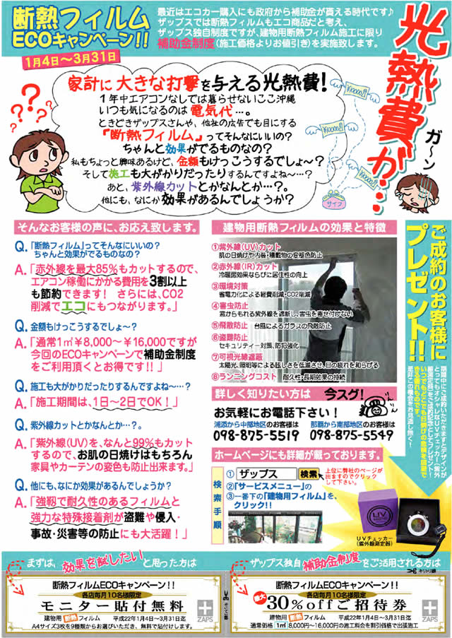 建物用フィルムに限り、ザップス独自による補助金制度(施工価格よりお値引き)を実施します。(有効期限は2011年1月4日から2011年3月31日まで)