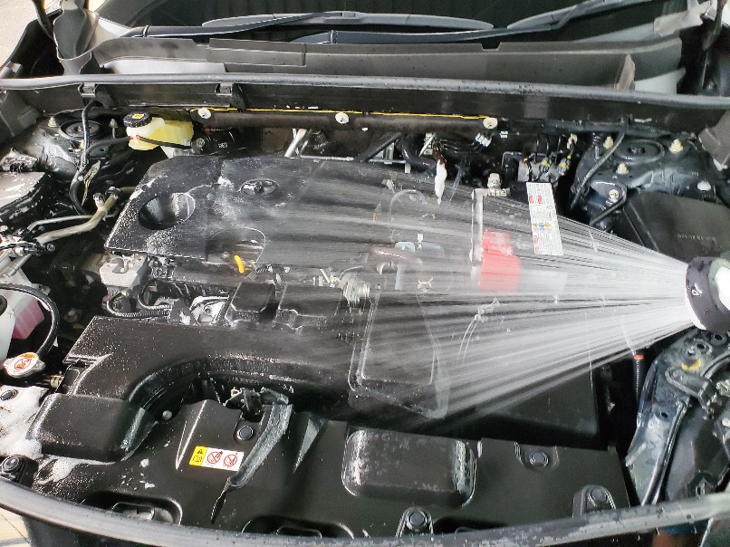 盛大に洗っていきます。エンジンルーム内は基本すべて耐水・防水なので、思っているより濡らせます。