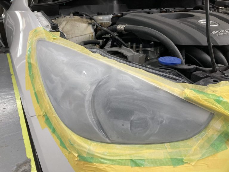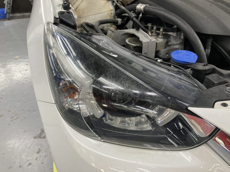 今回の入庫はマツダデミオのヘットライトのくもり補修です。