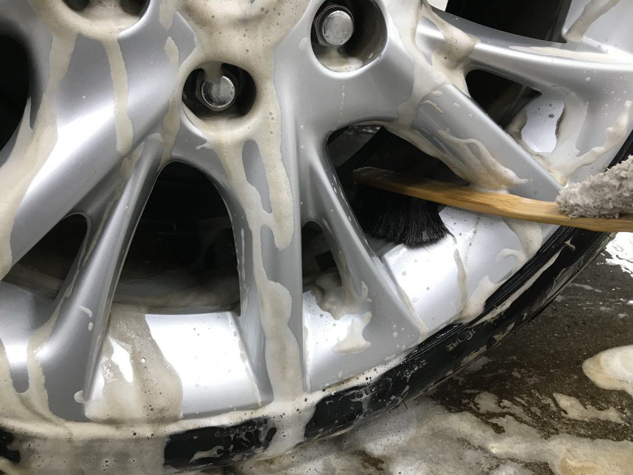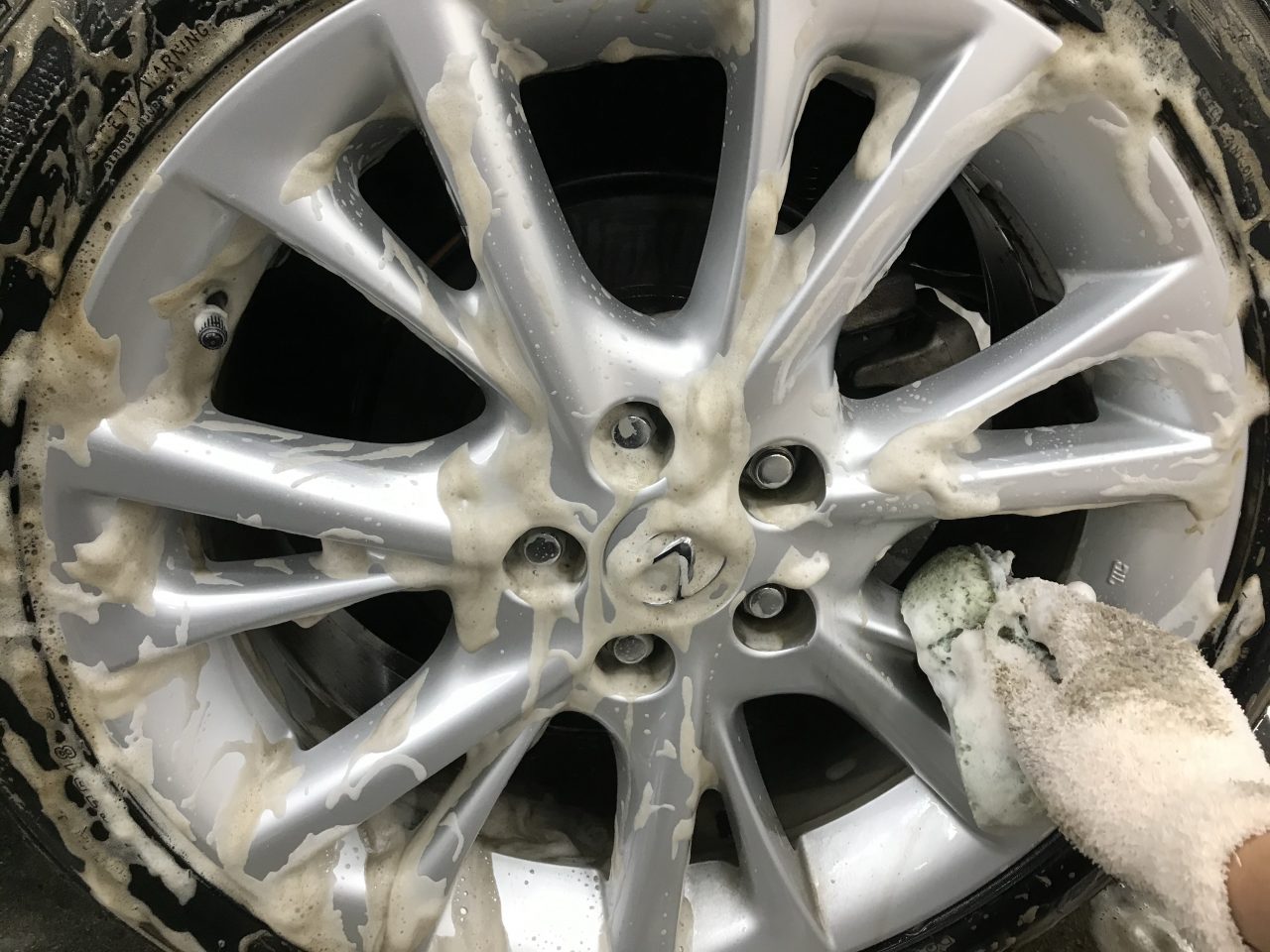 専用の洗浄剤と柔らかいブラシでブレーキダストを落としていきます。