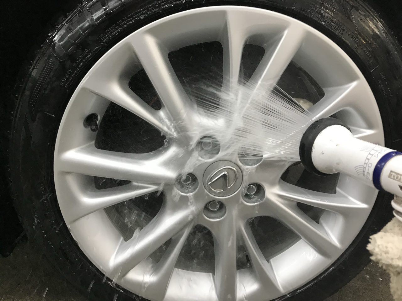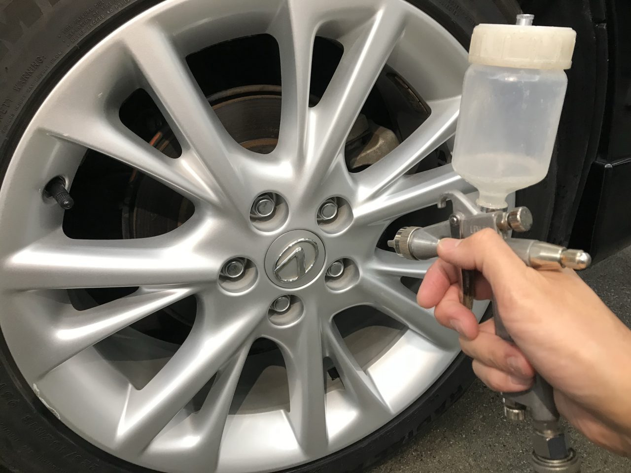 洗浄後、キレイにエアーブローで水分を飛ばして脱脂を行いホイールコーティングを吹き付けていきます。
