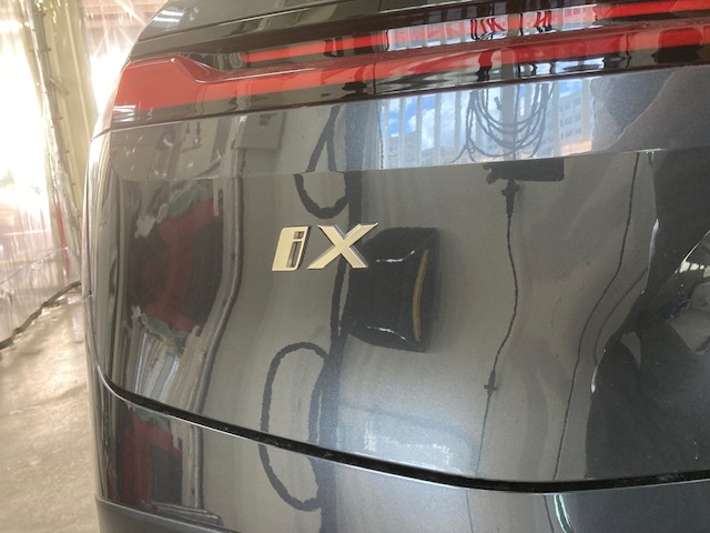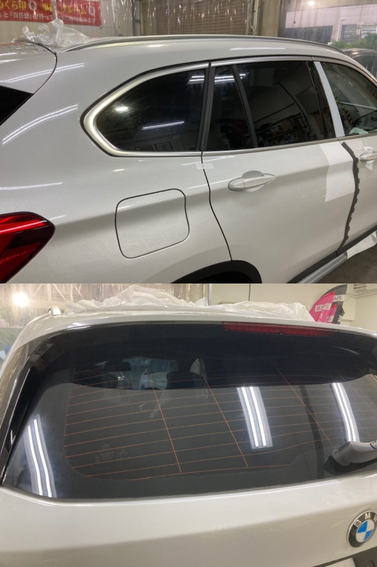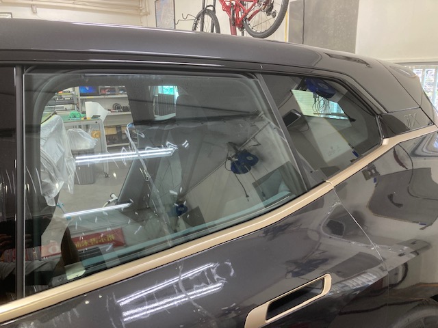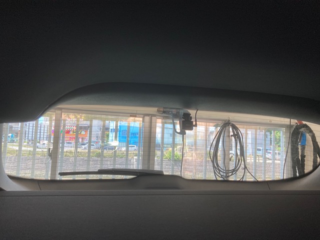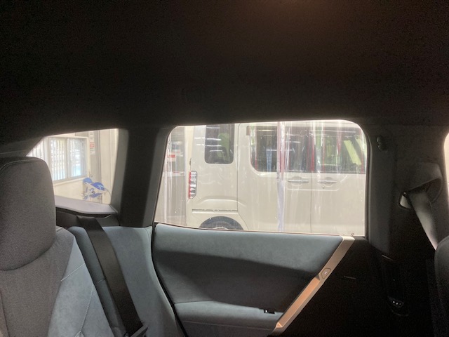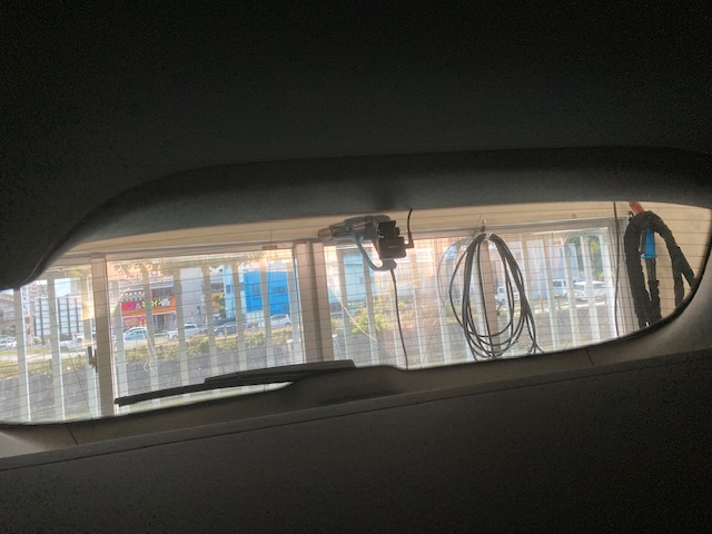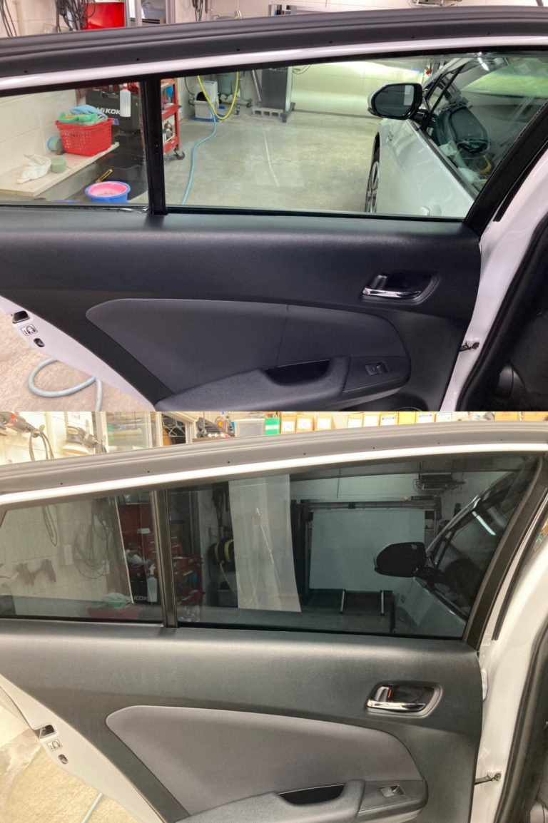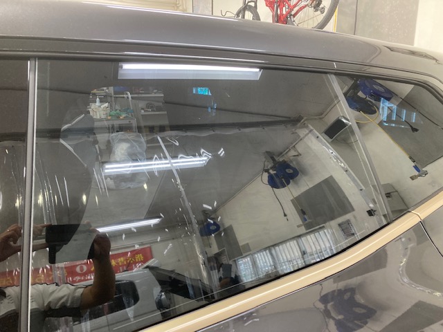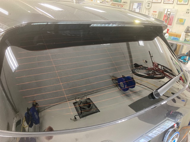 フィルム剥がし後 全体に糊が残っているため リアガラス熱線にも注意しながら糊の除去作業です。