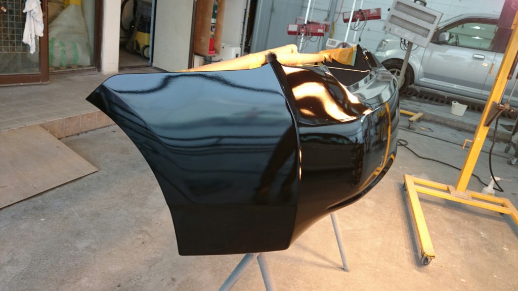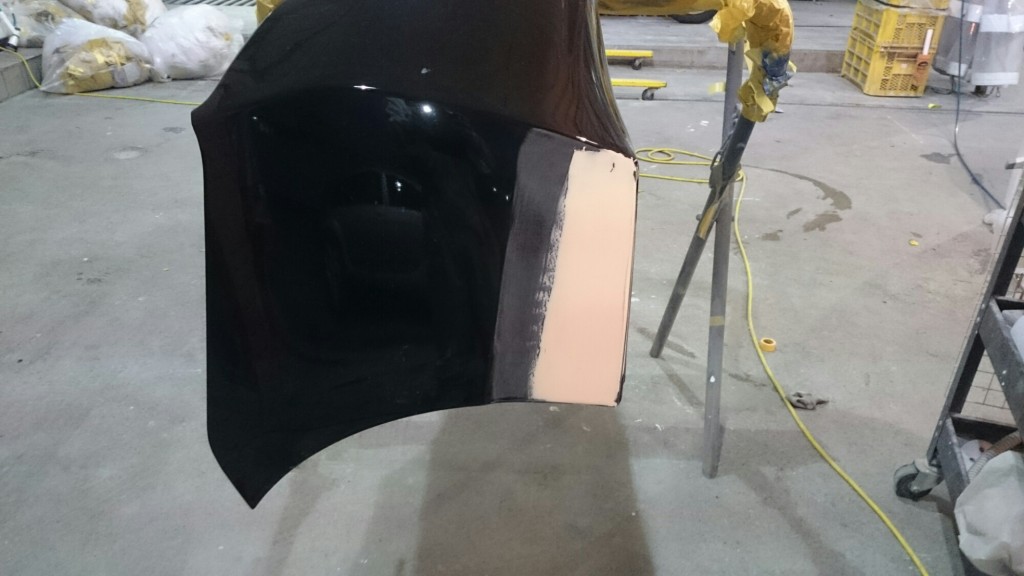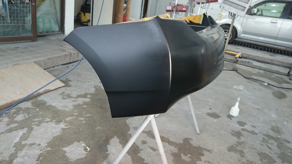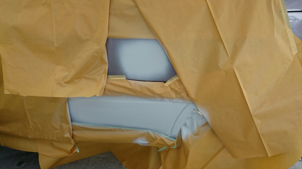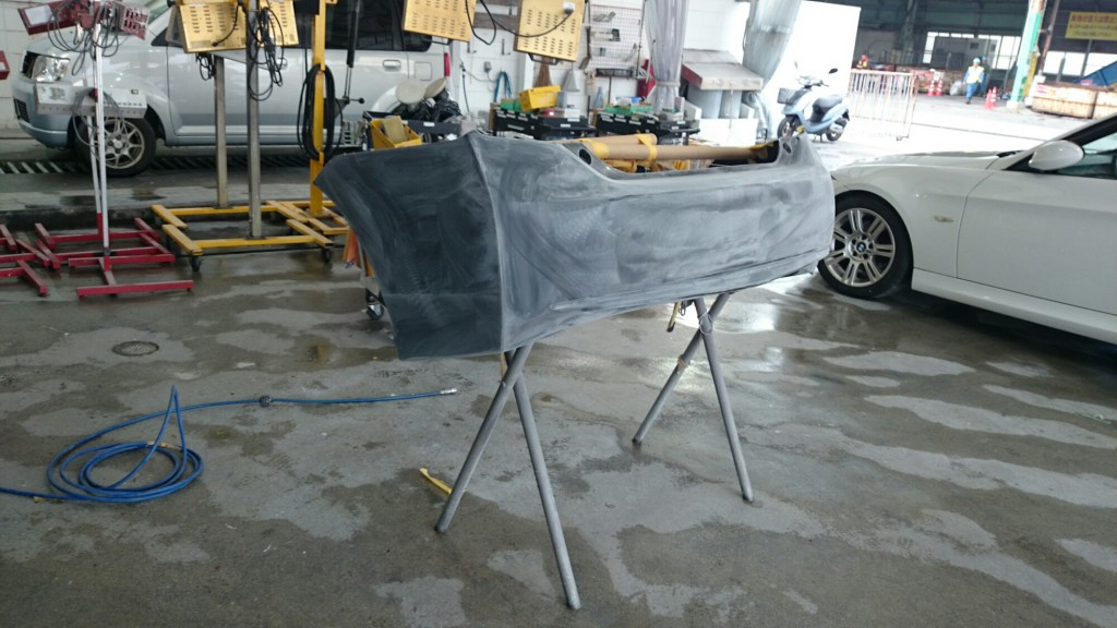 ↑バンパーを車に着いてる状態に、セッティングをし直し、サフを研ぎます。写真では、サフのカスが乗っているので、これをキレイに落とします。