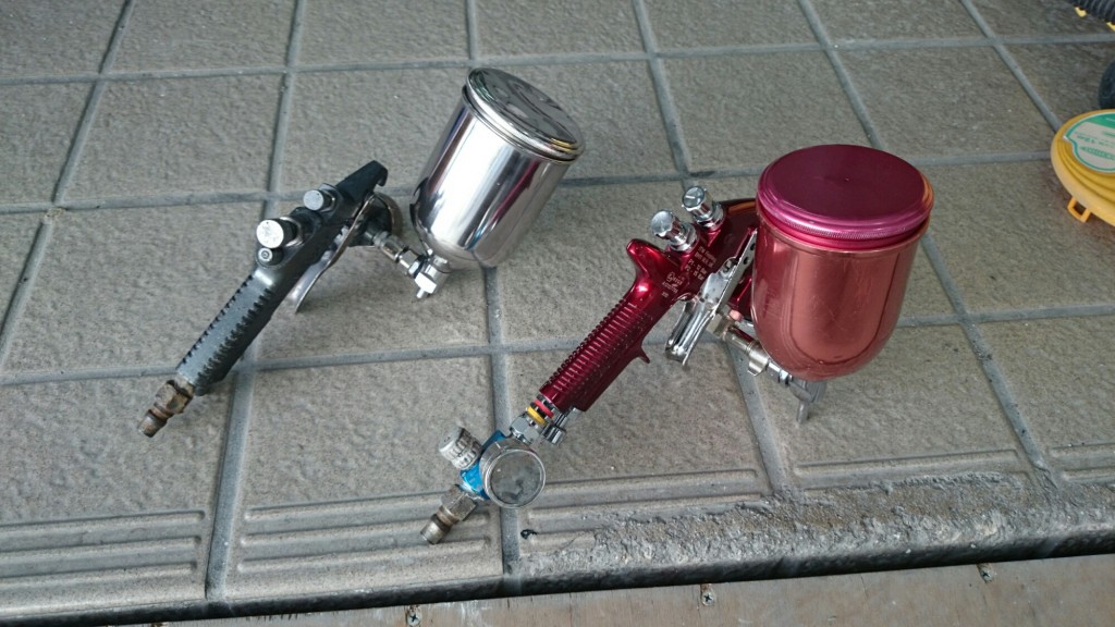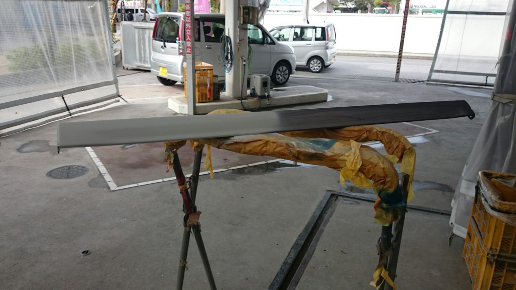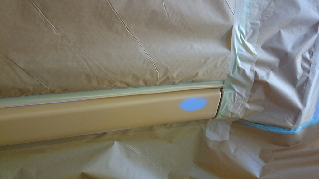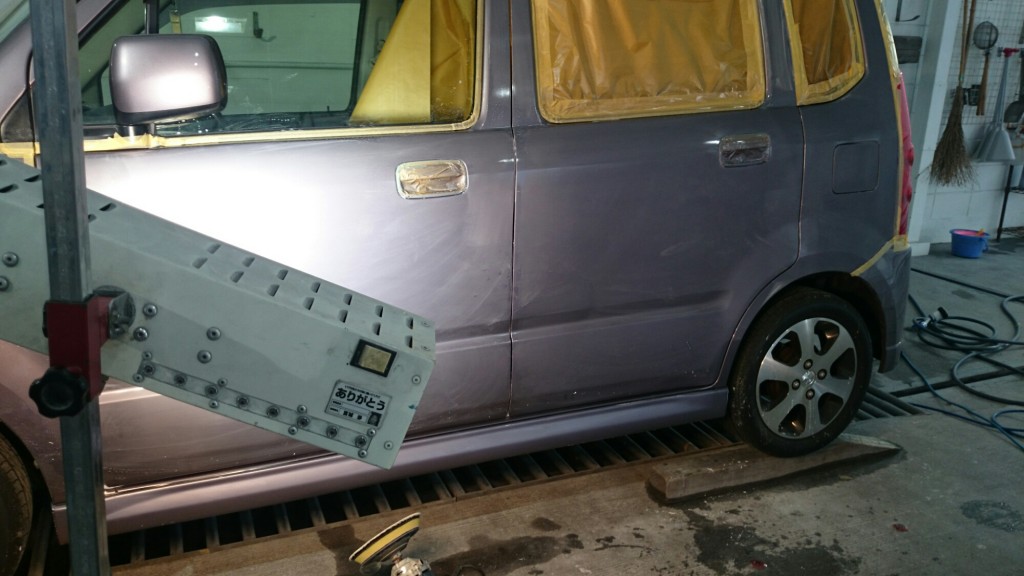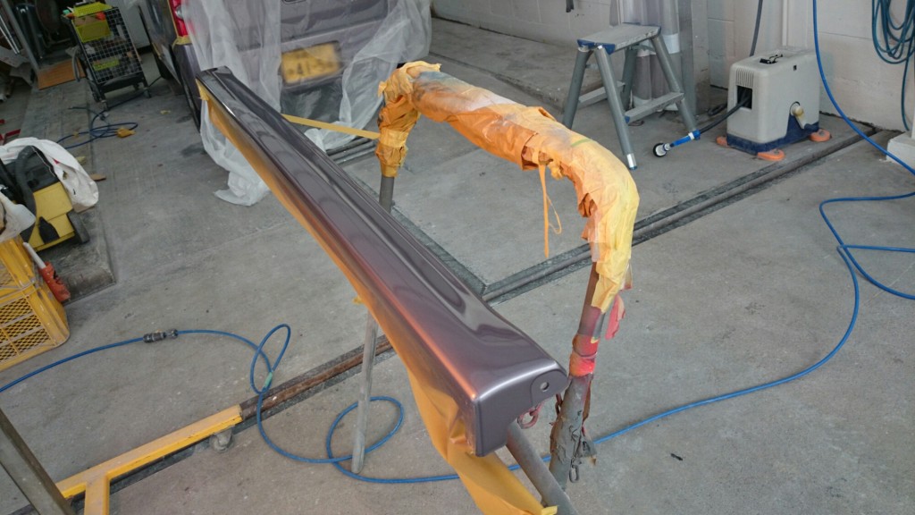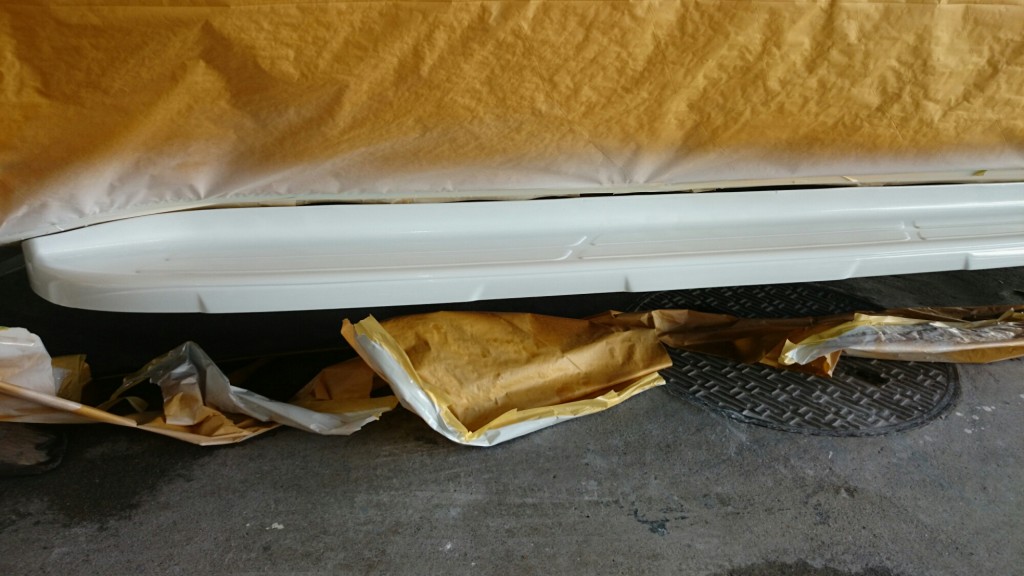 ↑バンパーを車に着いてる状態に、セッティングをし直し、サフを研ぎます。写真では、サフのカスが乗っているので、これをキレイに落とします。