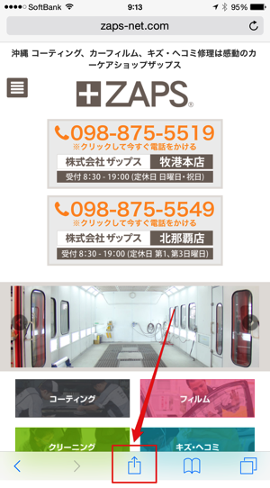 まずは、ザップスのホームページをiPhoneで開き少し画面を上下に動かすと下の画像の赤い矢印が指すものがでてきます。