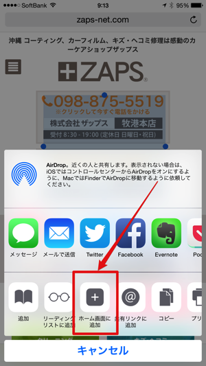 このようにホーム画面にザップスのホームページを配置して、いつでもすぐにホームページへアクセスすることが出来る様になります。
