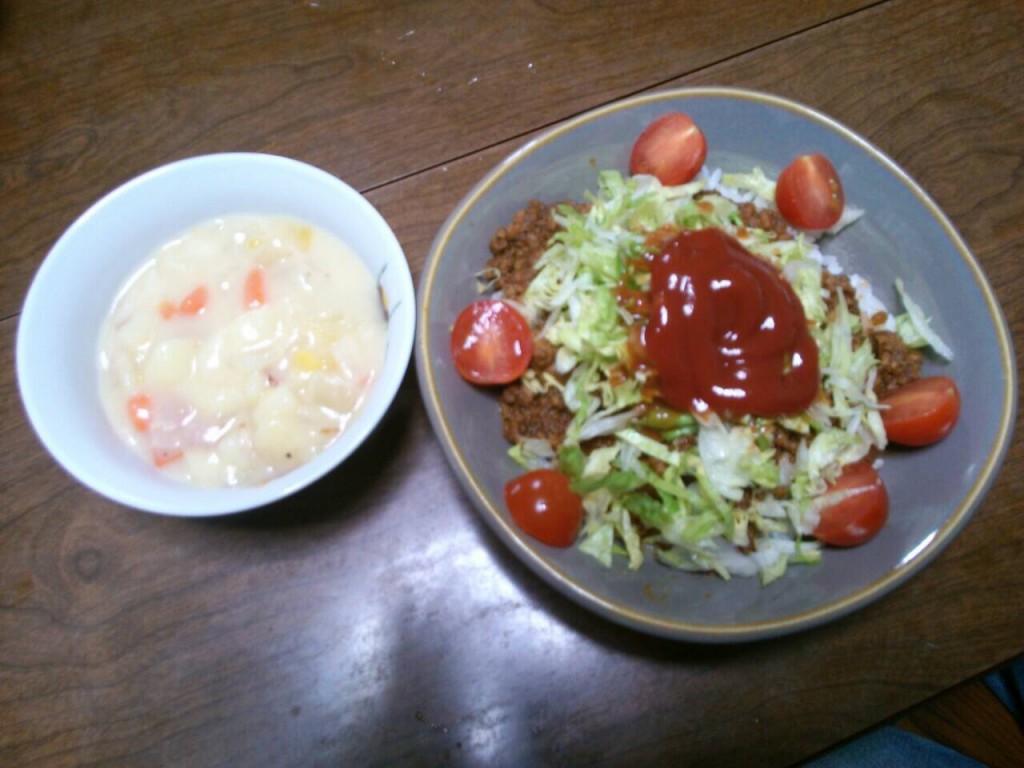 ありがとう*\(^o^)/*〜沖縄のコーティング、カーフィルム、キズヘコミはザップスへ〜 2015年1月29日 北那覇フロントから 夕ご飯の支度の段取りをあれこれ考えながら家へ帰ると なんと!ダンナさまが “タコライス” を作ってまして!∑(゚Д゚)! しかも、挽肉から炒めて ソースも手作りなんです!(°_°)! お野菜ゴロゴロクラムチャウダーも ございまして!∑(゚Д゚)! 大変美味しゅうございました ( ´ ▽ ` )♪ありがとうございました(*^^)v