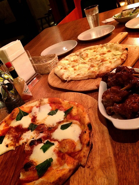 北谷町にあるベラ ナポリさん(^O^)種類が豊富で大きなピザとチキンやサラダなどどれも美味しそうなメニューの中からシーザーサラダとマルゲリータ、チーズピザ、フライドチキン(テリヤキ)をチョイス!!