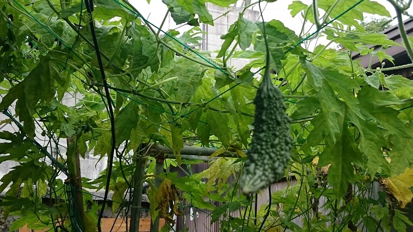 沖縄の夏バテ防止の定番のゴーヤーの第一号が與座家の家庭菜園に実りました( *´艸`)