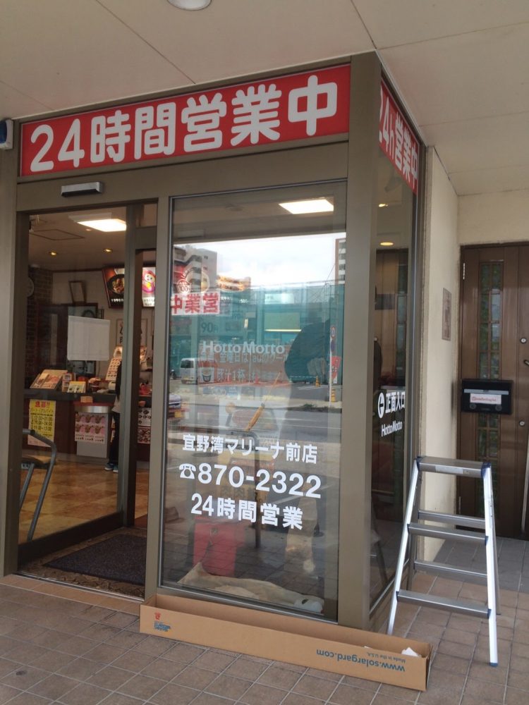 入口付近で 車両が衝突してしまいガラスが割れたことで フィルムの貼り換え作業
