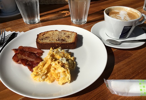 ベーコンとスクランブルエッグ、カーサブレット(←外側カリカリ中シットリでとーっても美味しかったです)