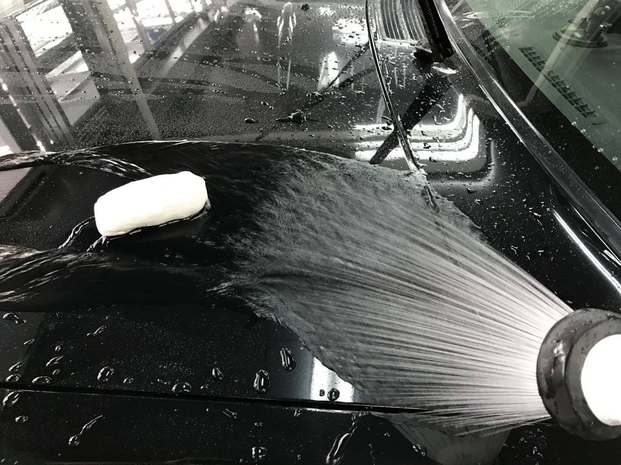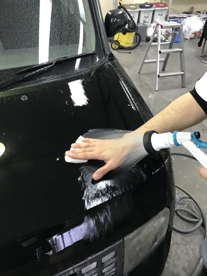 作業ではボディー全体水をかけながら、粘土でこすって付着物(鉄粉・ミスト・ペンキ・虫の死骸など)を除去します