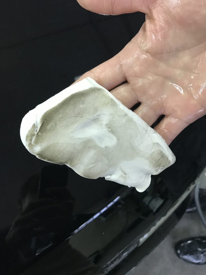 ボンネットを粘土作業していますが御覧の通り粘土が真っ黒になり付着物が除去出来てるのが分かります