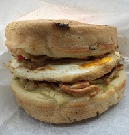 たこ焼きの生地(たこ・キャベツ・ネギ入り)を大判焼で焼き、中に焼きそば・目玉焼き・天かす・紅ショウガ・青のり・かつおぶし・ソースが入っています♪このボリュームでなんと160円✨