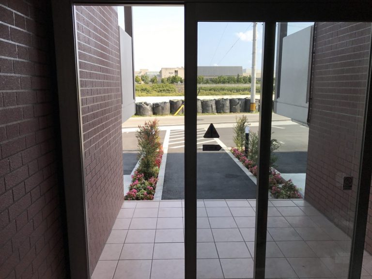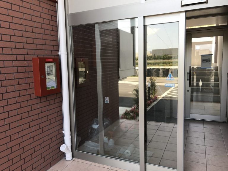 右が自動ドア施工済み 左はドアが開いた状態ですので硝子無し