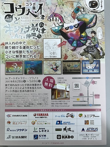 コウヘイ君4歳(当時)が落書きした作品に前津さんや5名の仲間がアレンジをし、アート化した作品を展示する特別企画展がゴールデンウイークに沖縄市アートギャラリー・ソラノエさんで行われるそうです(^^)
