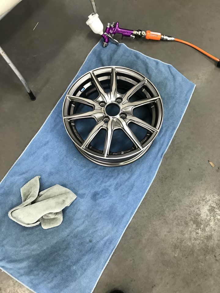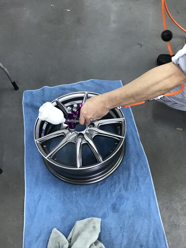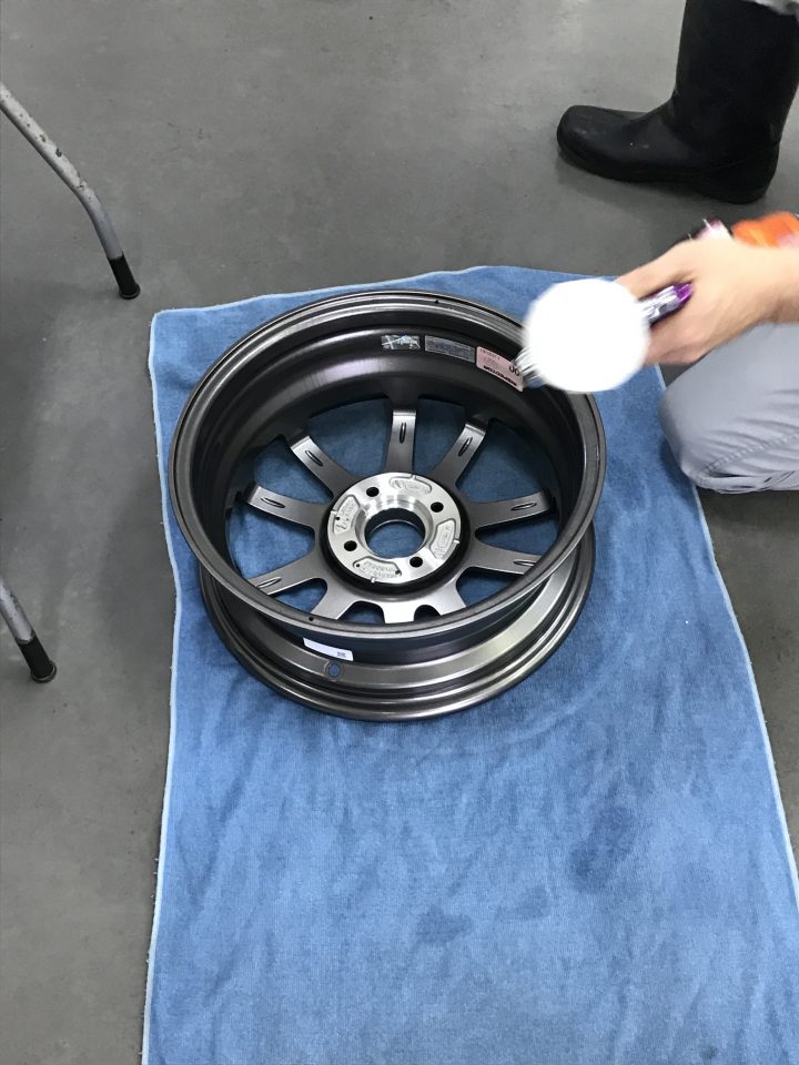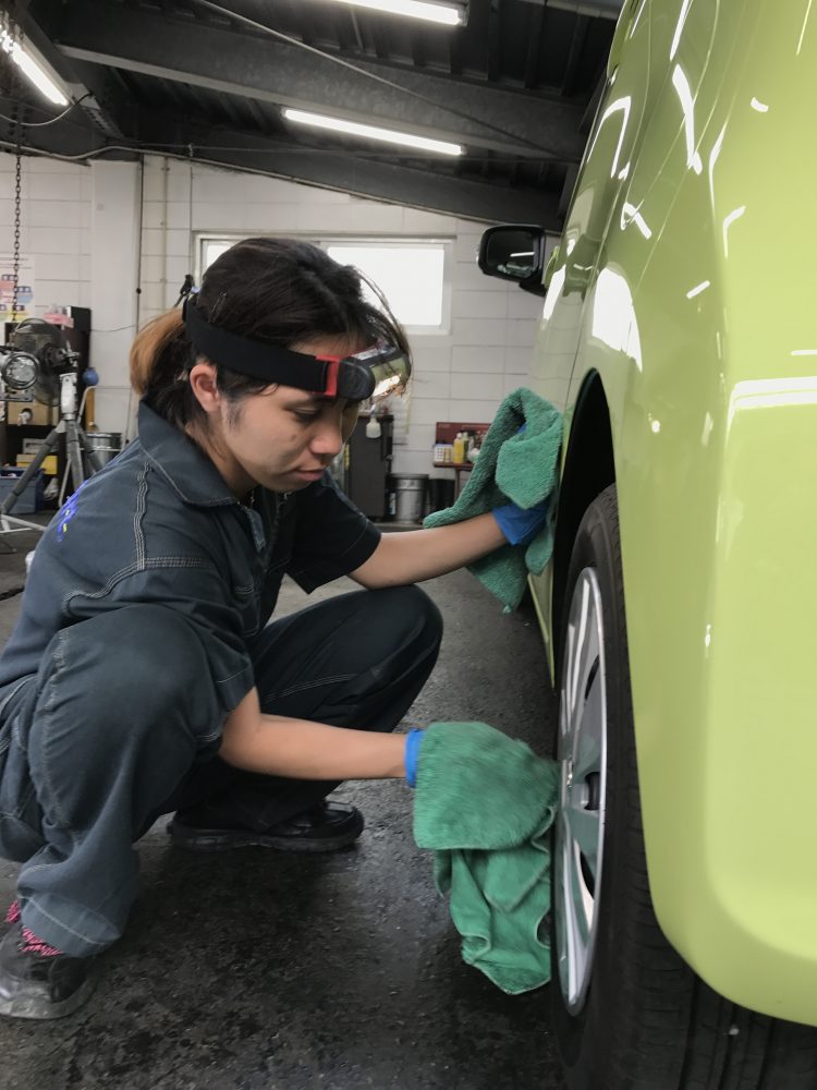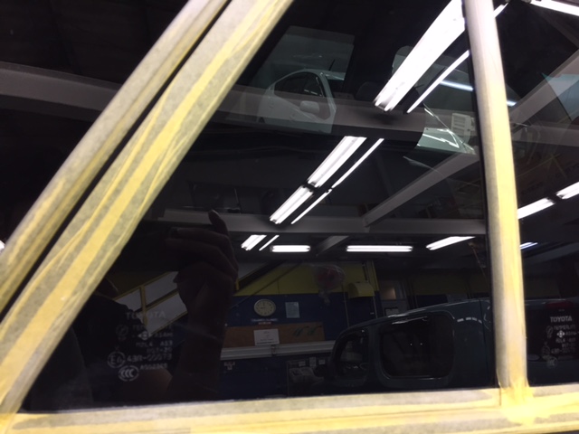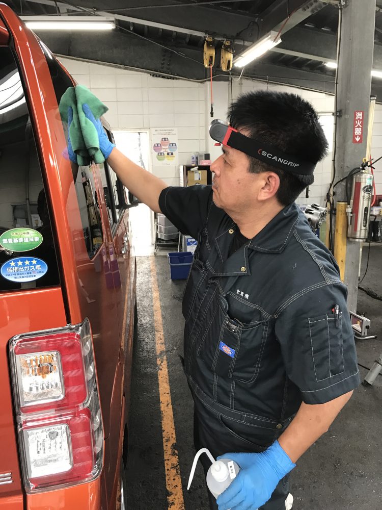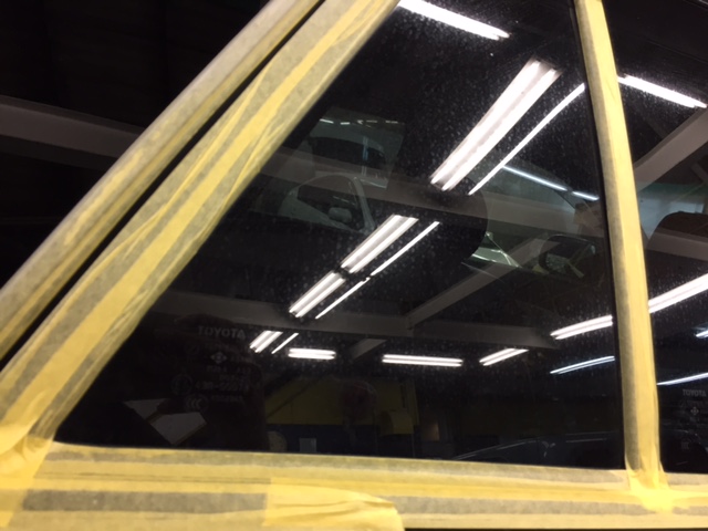 ガラス専用のクリーナーで磨いていきますガラスとコート剤が密着する為に必要な工程でかなり体力が必要なので気合いで磨きます。