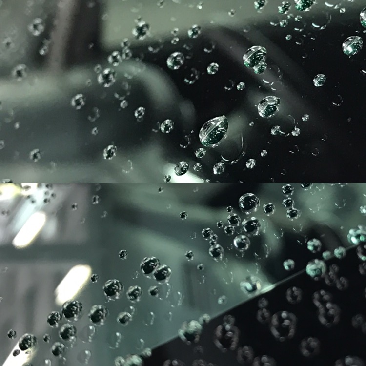 上が施工前、下が施工後です。水滴の形が違うのが分かると思います。水滴が丸ければ丸いほど撥水しているということです。