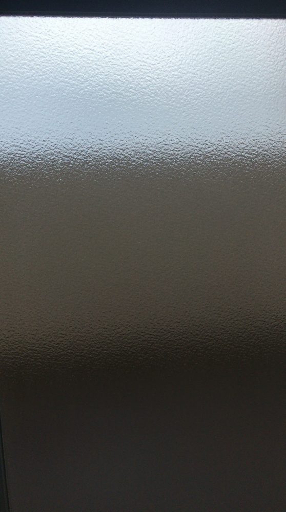 これは、スリガラス表面の細かい傷が目隠しになっており施工後 隙間に水分が入ると半透明になるのです。