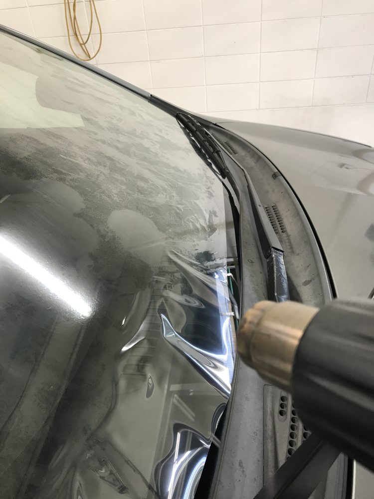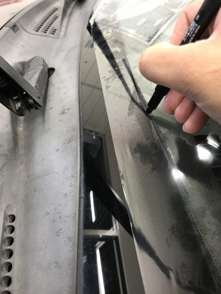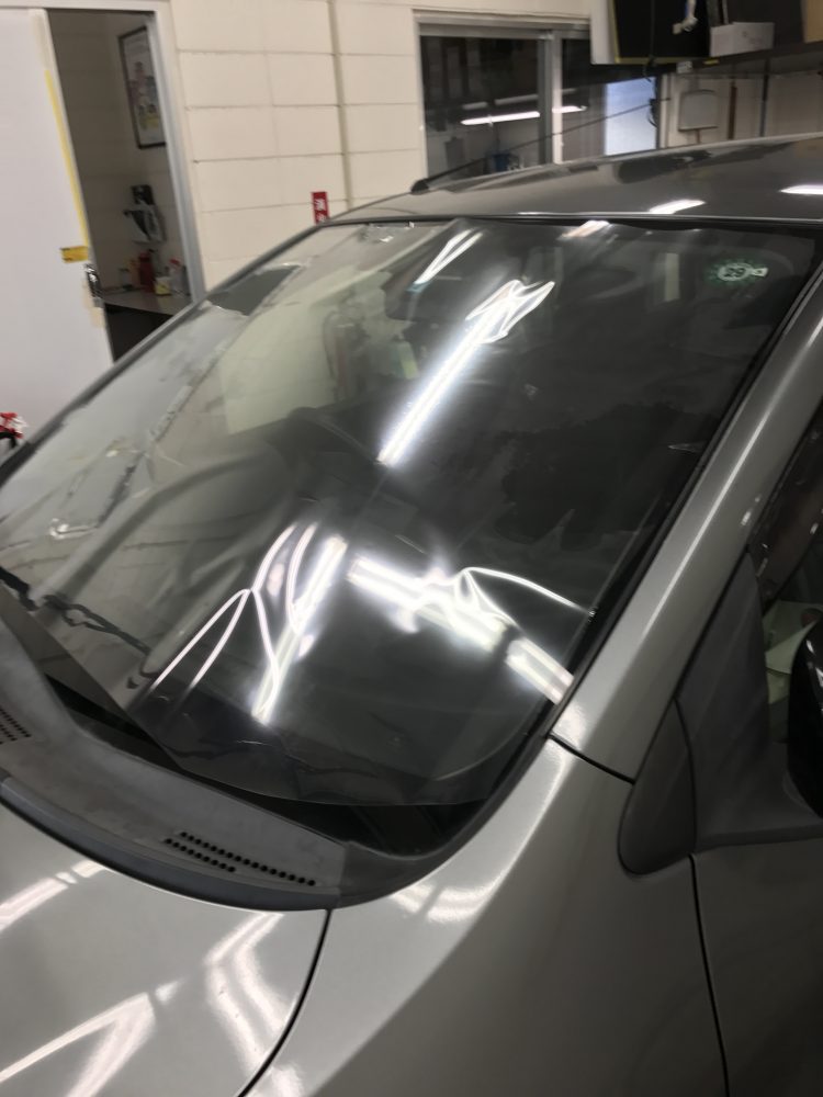 フロントガラスへの施工、サイドガラスよりもちょいと手間がかかりまして…