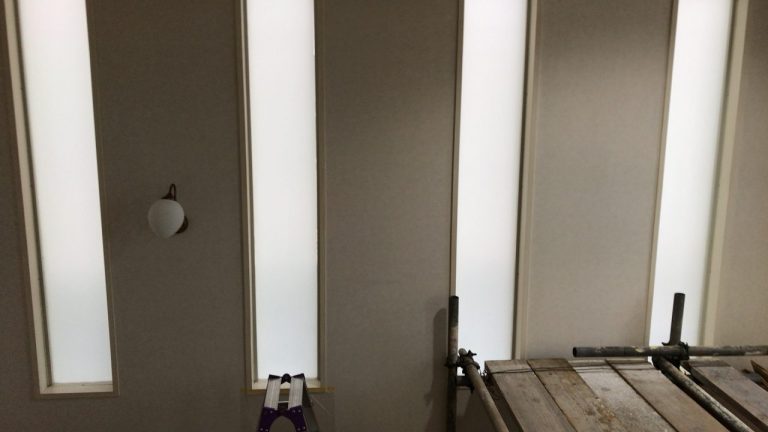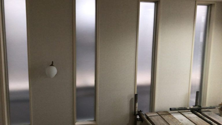 吹抜け階段場所で細長い窓ガラスの施工となります。