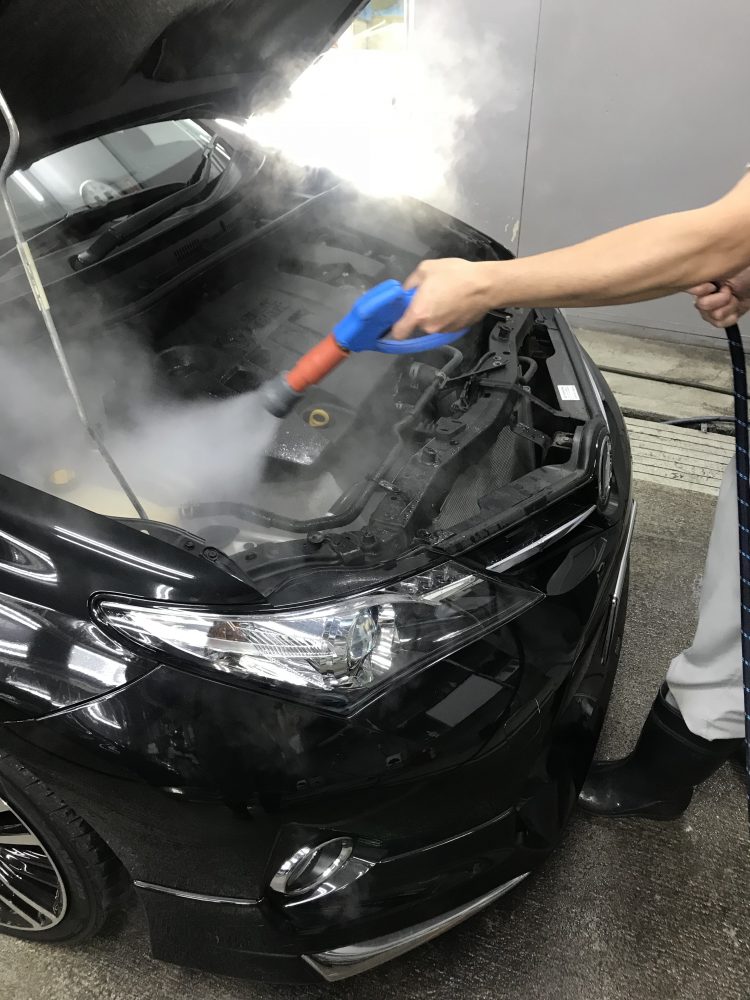 スチーマーを使用してエンジンルームを洗浄していきます。