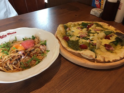 パスタやピザの種類が多くてとっても迷いましたが、この日はイカと明太子のパスタとジェノベーゼピザを頼んでみました。