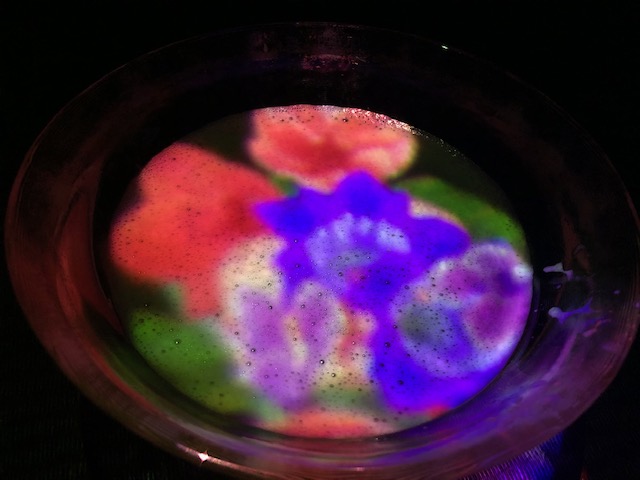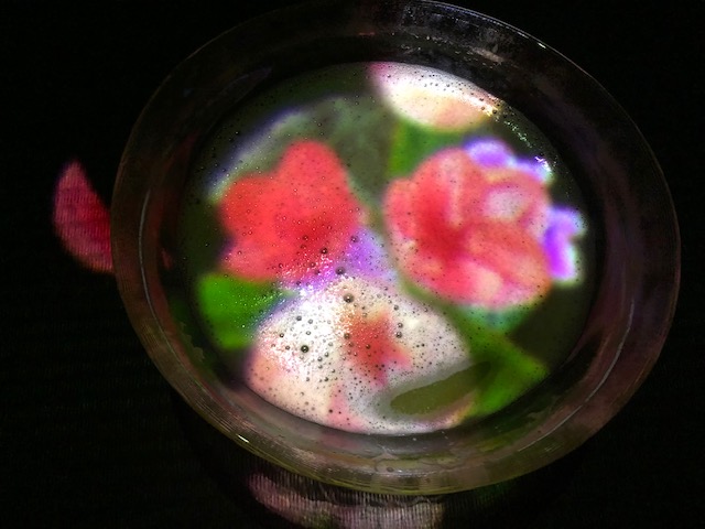 お茶コーナーではお茶の泡に光があたり、花が咲き、容器を持ち上げると花が散るといった