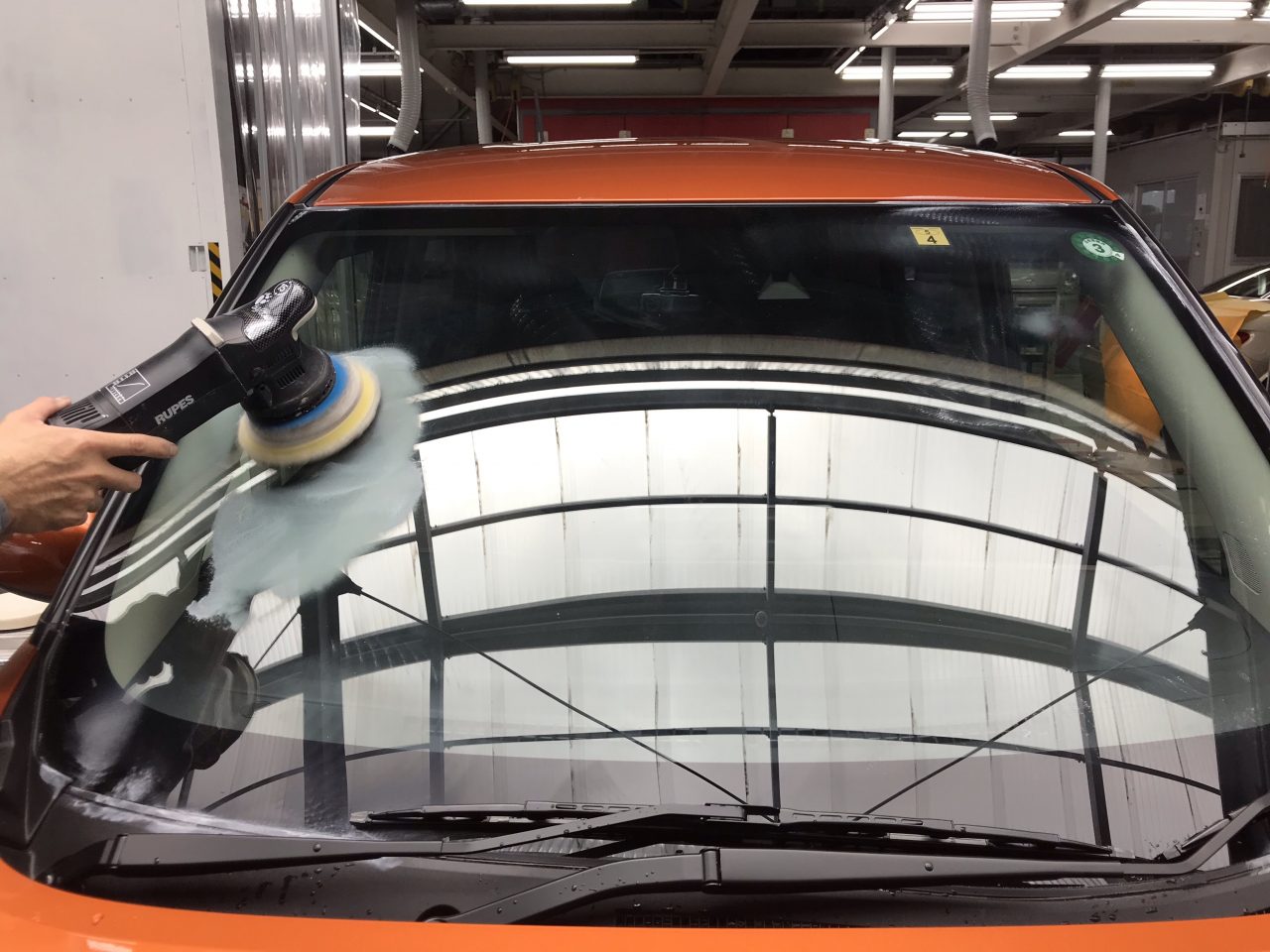 隅々まで磨き、ガラスを洗浄し水滴の拭き取り後、脱脂し撥水剤を塗り込みヒーターで乾かしていきます。