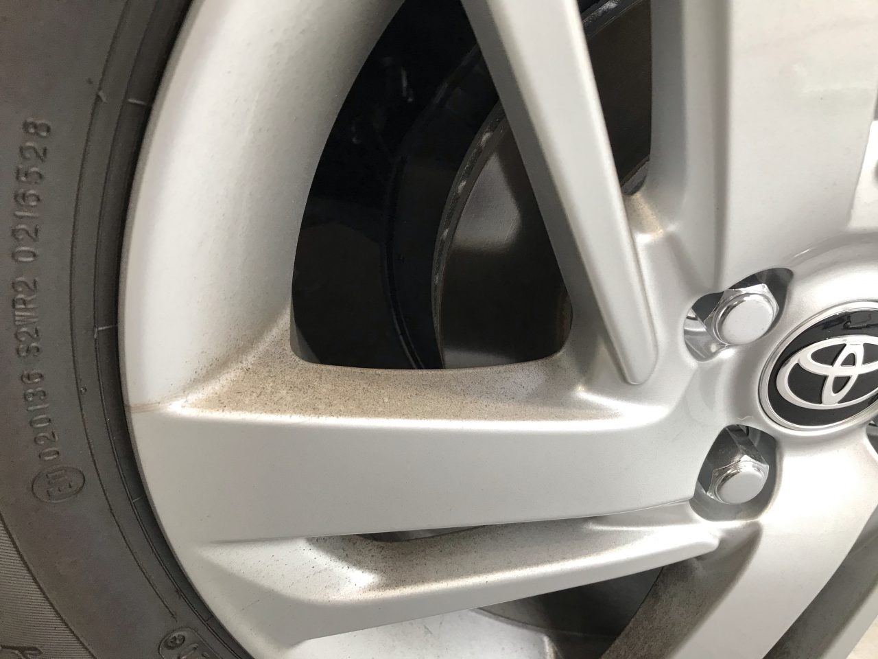 ホイールのリム・スポーク等にブレーキダストやピッチタールが付着しています。洗浄を行いキズやサビのチェックをしていきます。