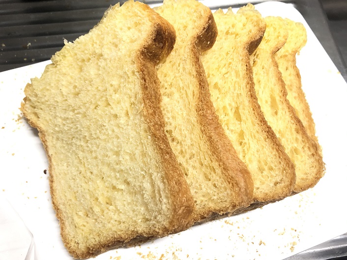 出来立てのホカホカをちぎって食べるのも美味しいですが、今回はスライスして食べるので、冷ましてスライス!