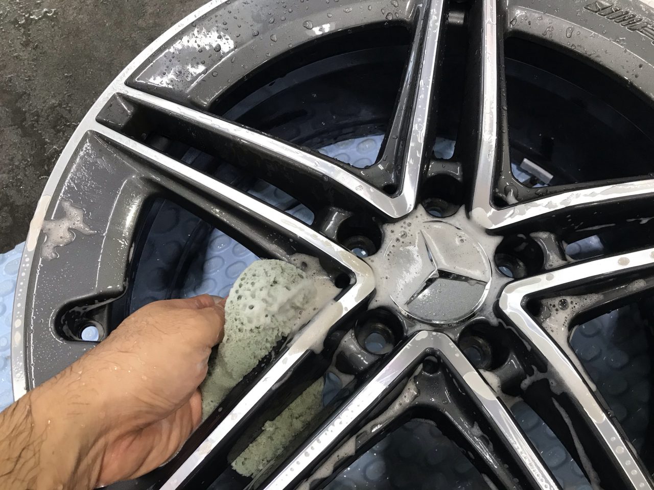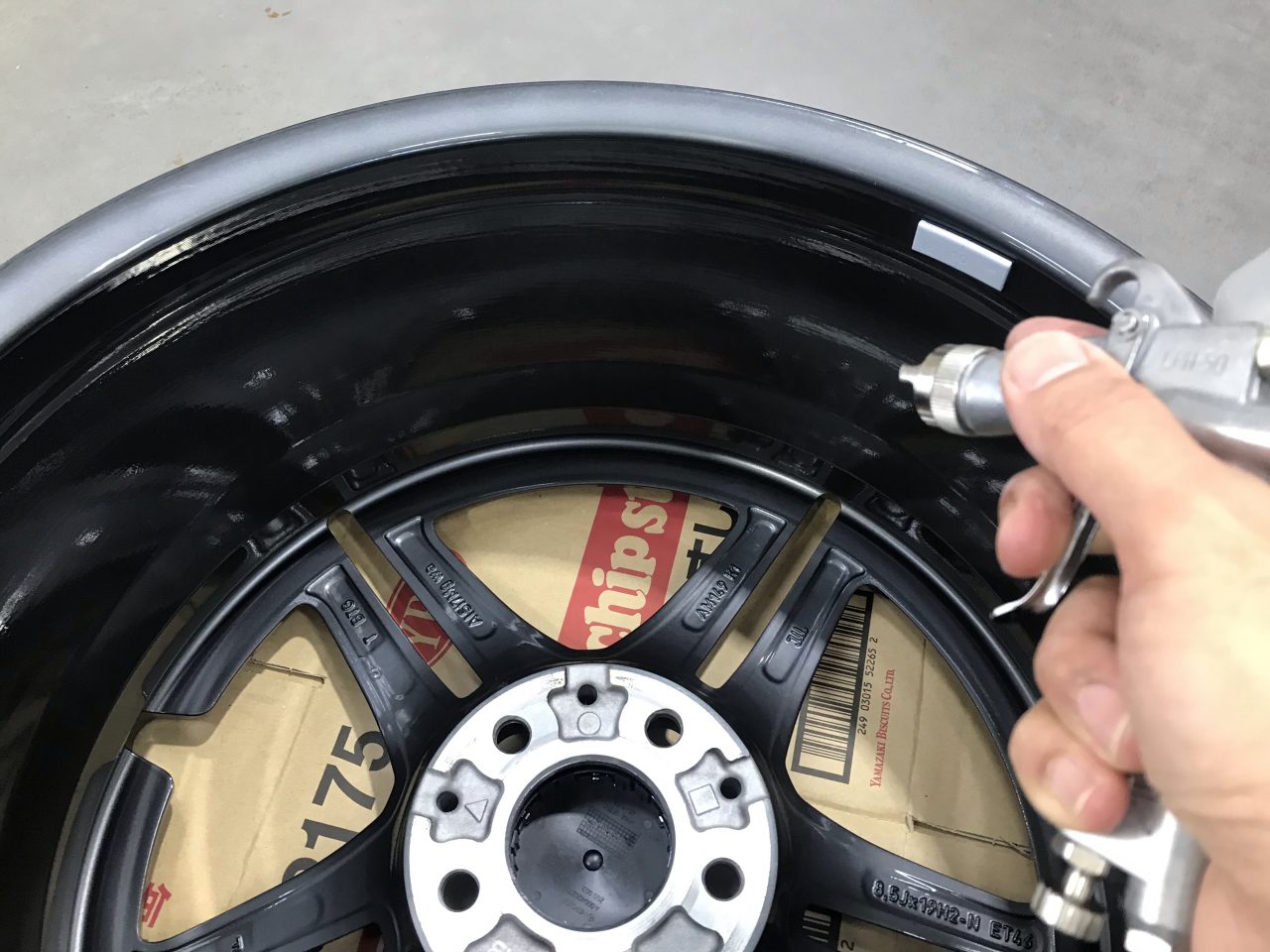 下地処理が終わり、ホイールコーティングを塗布していきます。脱着した状態なので内側までキレイに施工ができます。