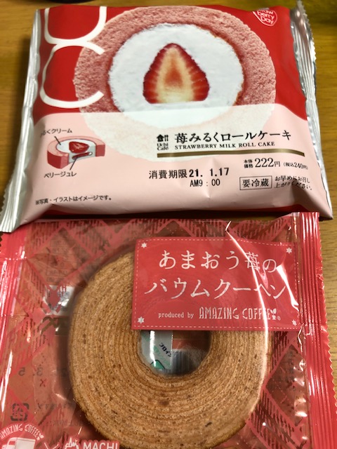 今度はローソンで苺みるくロールケーキ&あまおう苺のバウムクーヘンをゲット!