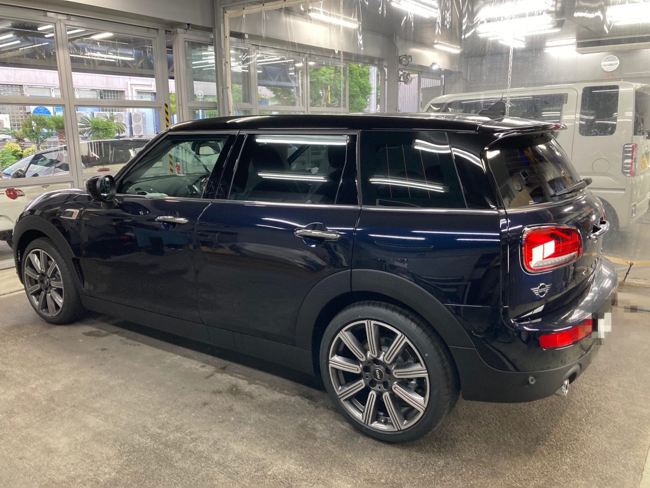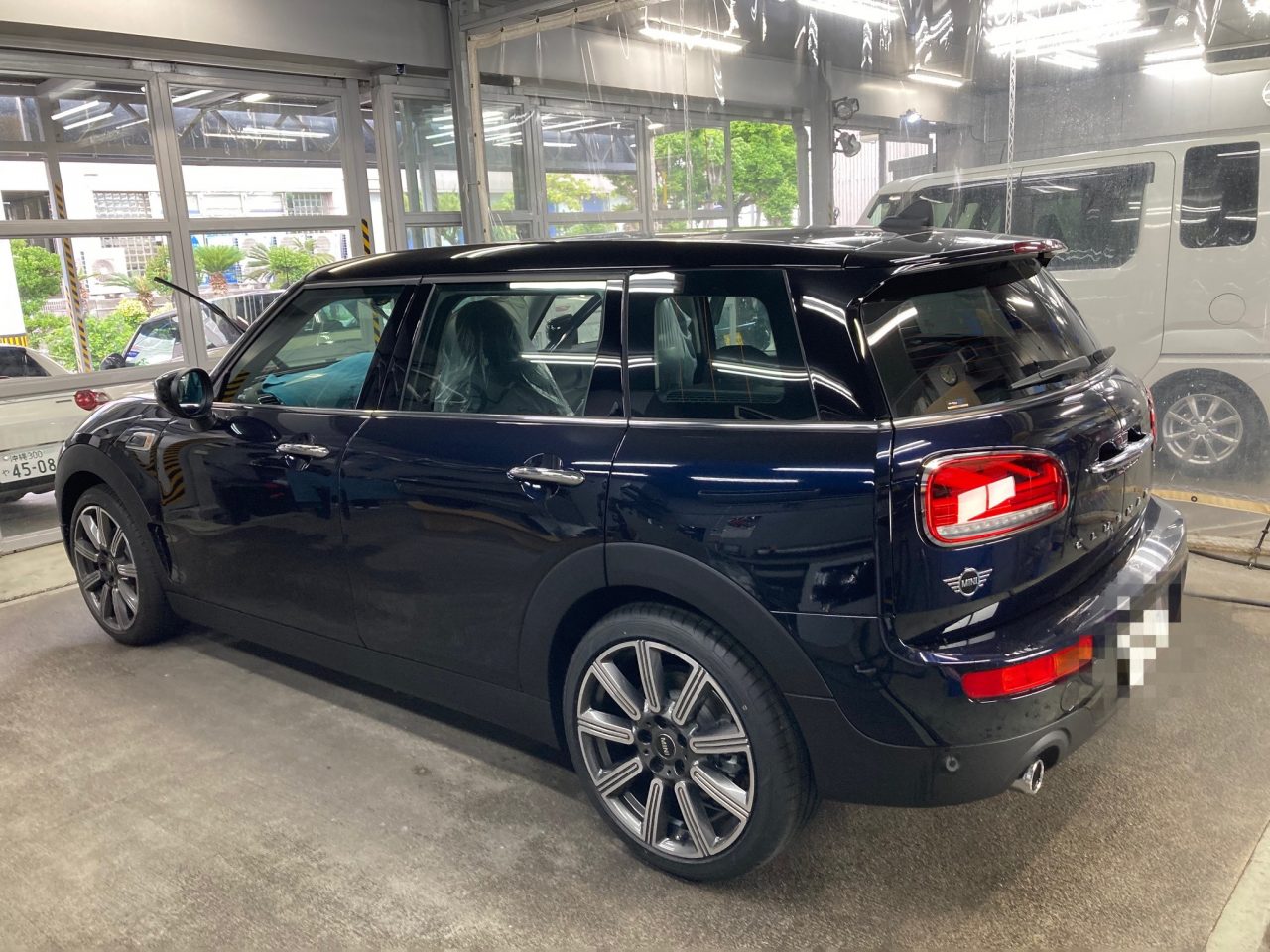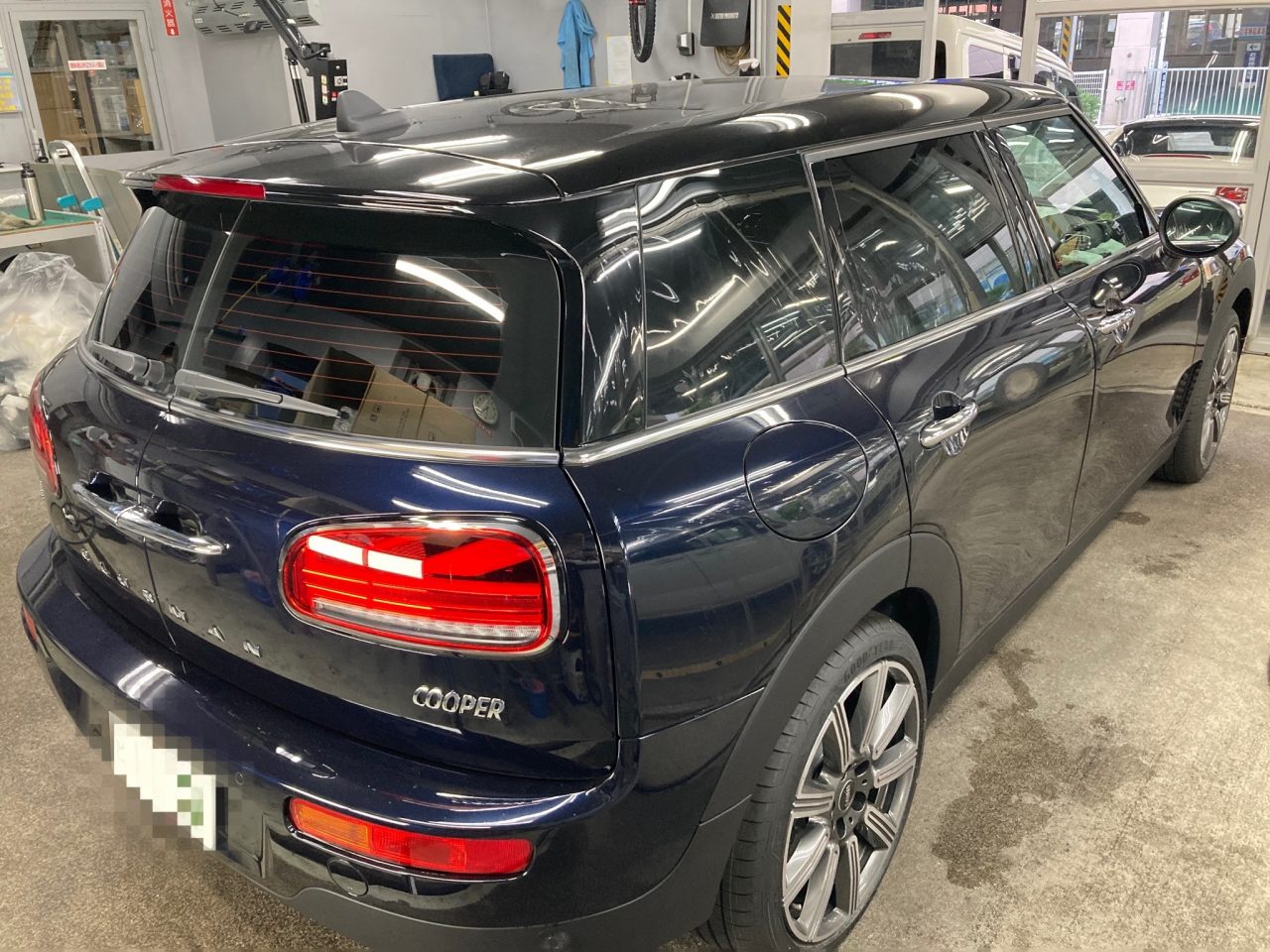 本日フィルムの作業で入庫した車両はBMW ミニクラブマンです。フロントガラス三面は透明断熱UVカットフィルムを施工し、リアガラス5面をこれから施工します。