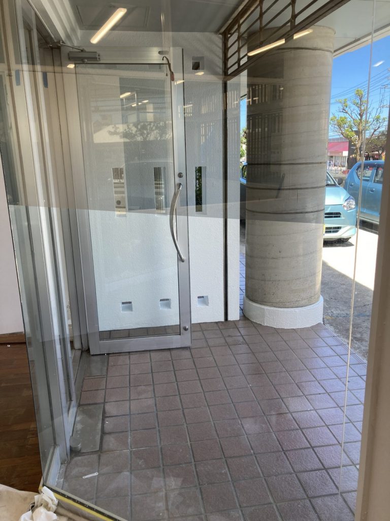 座る位置には目線が合うため外から見えないようにガラス半分は目隠し残りは遮熱フィルムを施工