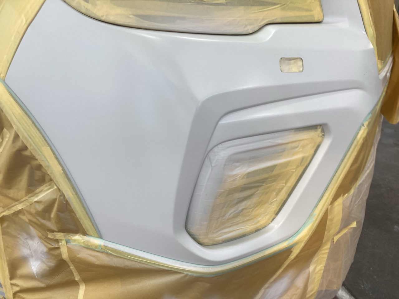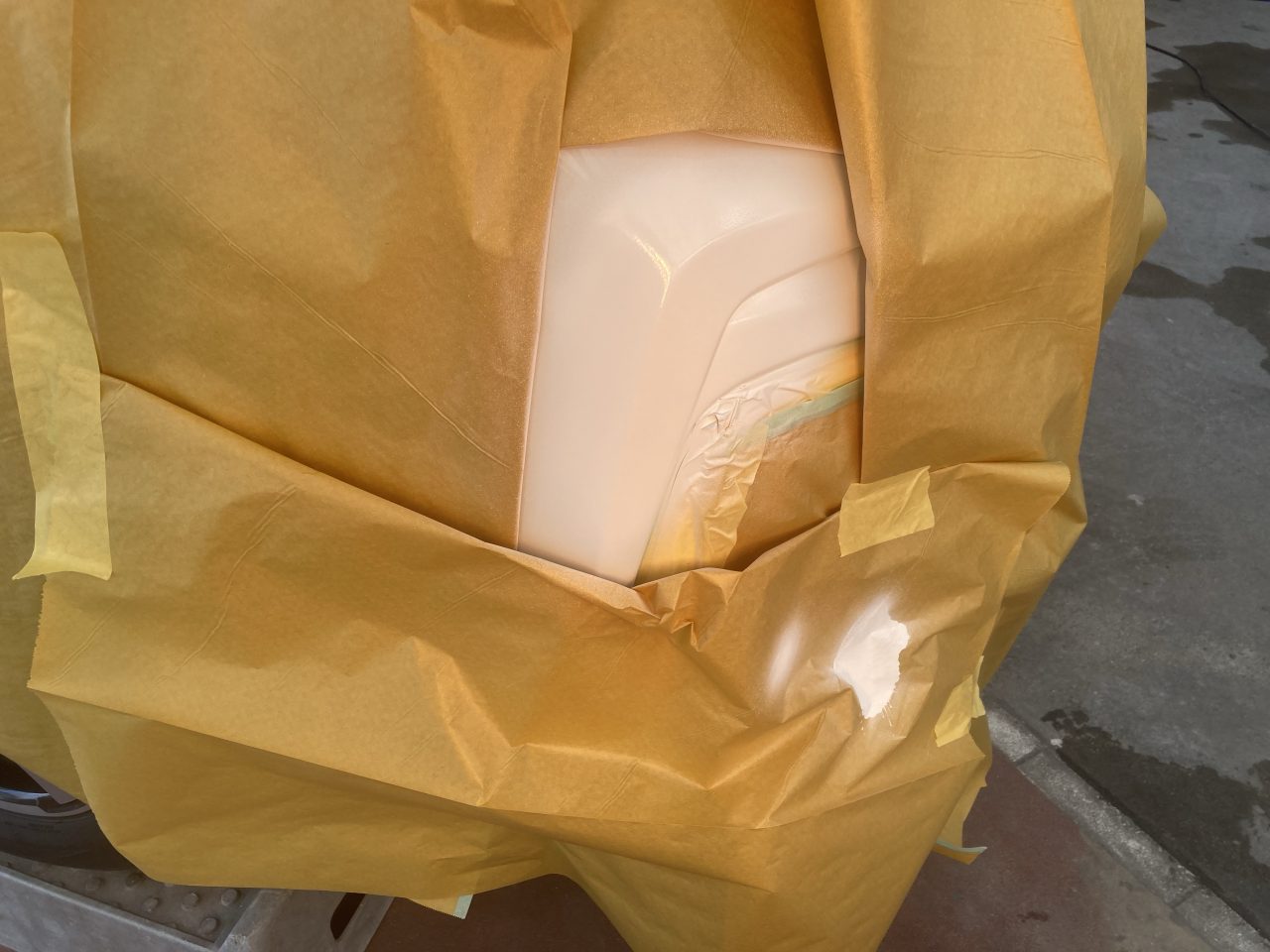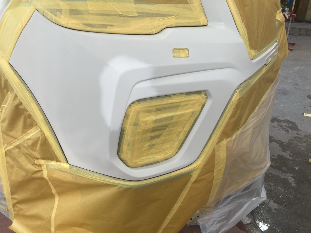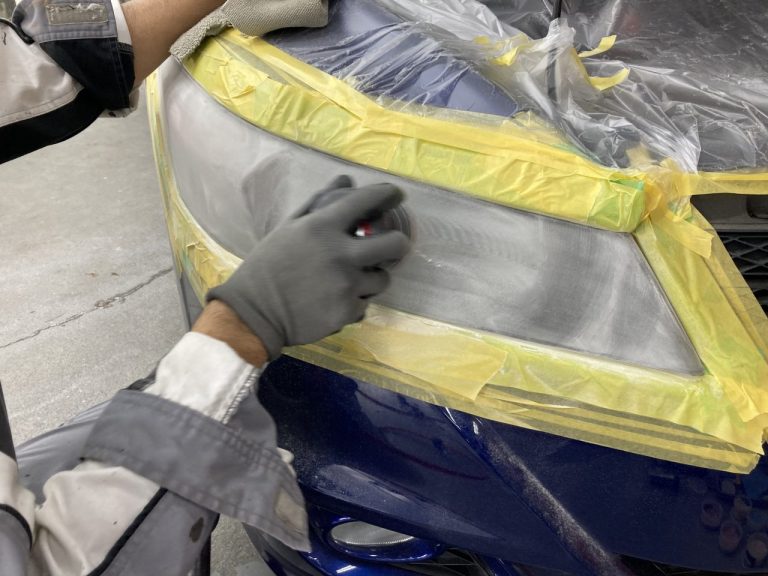 周りのパネルに傷が入らない様にマスキングして古いハードコートを削り取ります。