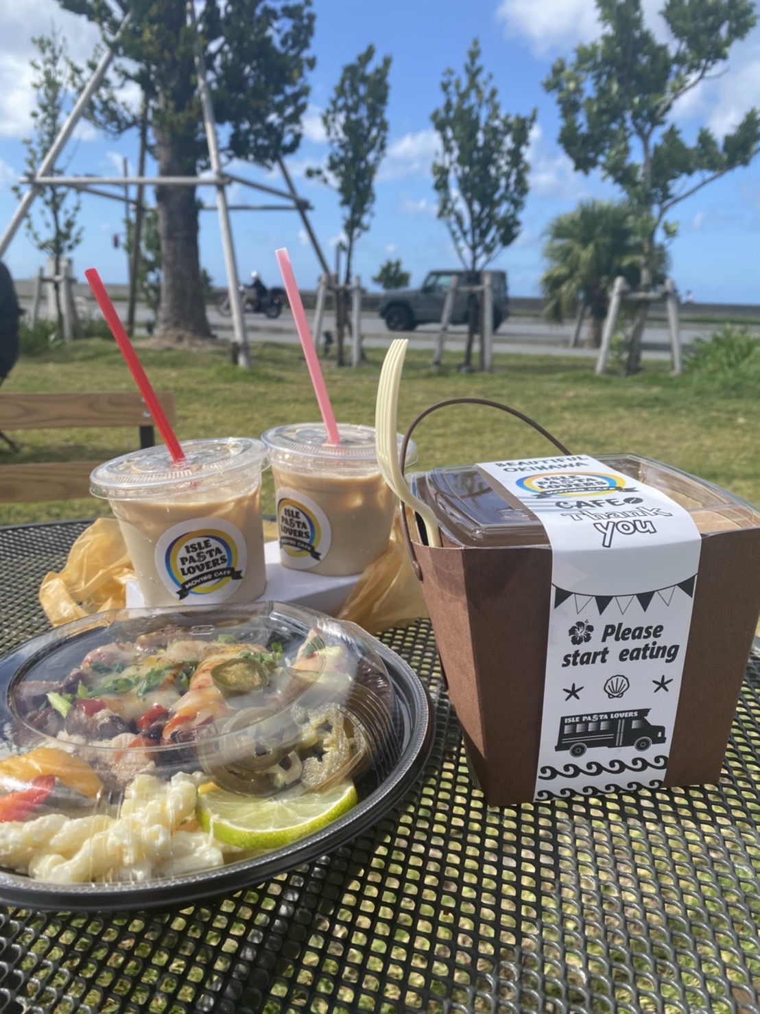 生パスタとチキン&炭火焼きジャークチキンとカフェラテ