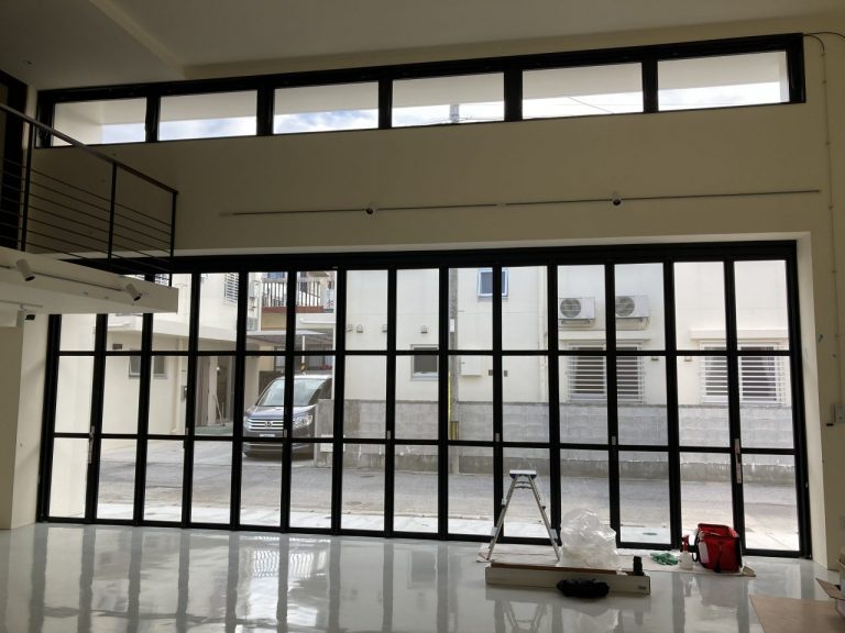 吹き抜け高窓ガラスは足場がある内に施工致しました。