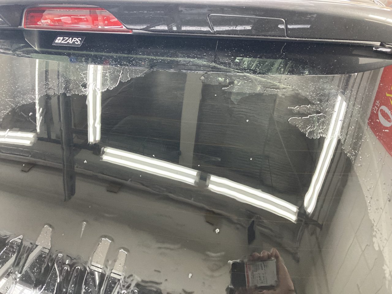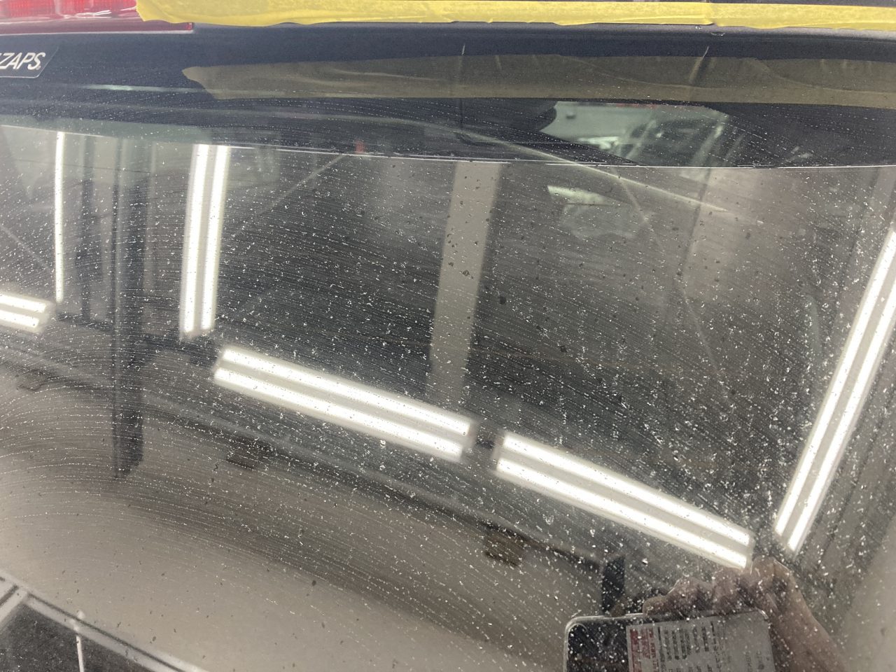写真は、リアガラスに水シミと油膜が付着し雨天時に気になるとご相談があり、全面ガラス撥水コートをしたいとご要望がありました。ガラス専用の研磨剤で磨き、洗浄・脱脂をし撥水コート剤を施工していきます。
