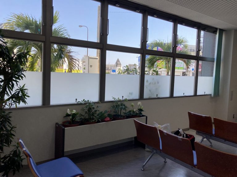 西日による待合室の暑さや太陽の眩しさ対策で今回一番濃いめのスターリング20を施工致しました。