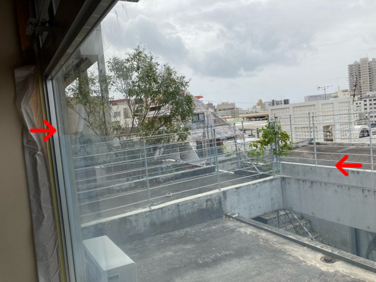矢印下ガラスは劣化したフィルム 視界の違いが分かりやすい!
